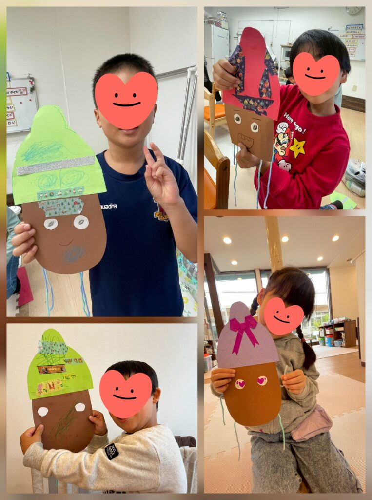 11月の壁面「手つなぎドングリ🍂」が完成しました😊ドングリの帽子に1人ずつ特徴が出ていますね~🥰みんな仲良く毛糸の手で手つなぎしています~🙋