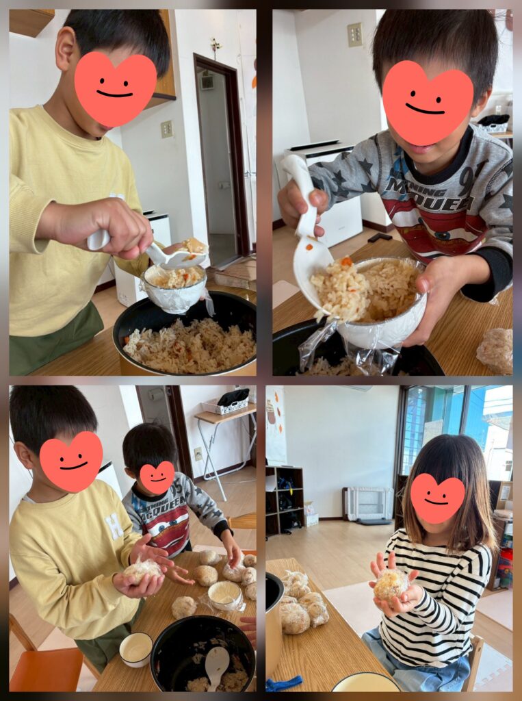 炊き込みご飯をラップでキュッキュッっと巻いておにぎりの出来上がり~🍙