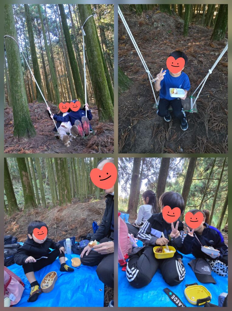 さっそく山の中のキャンプ場でお弁当を食べました🍱手作りブランコが大人気🤭そして鬼ごっこや探検が始まりました!みんなどこでも遊べます~😉