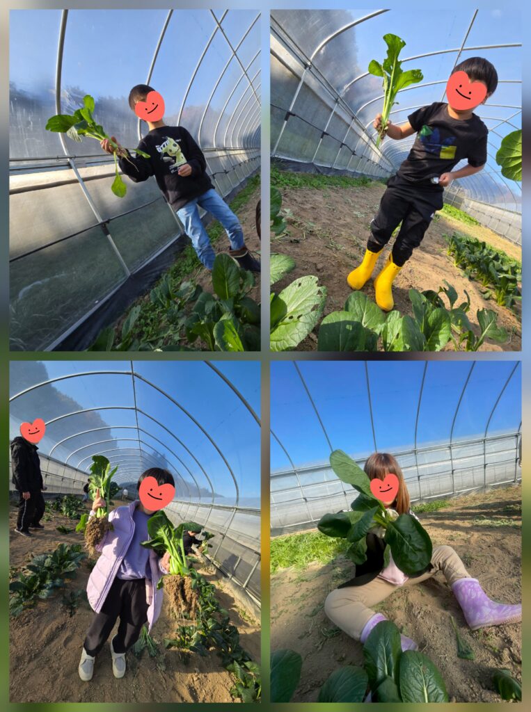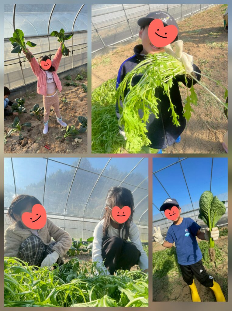 小松菜・水菜の収穫ではビニールハウスの中に入り抜き方を教えてもらった後、自分で抜いた分の重さを測って袋詰めしていきます🤗根っこが大きいと引っこ抜くのが一苦労😓でもたくさん抜いているうちに「回しながら引くねん!」「上に引っ張るねん!」とちょっとコツがわかってきた様子でした🙆