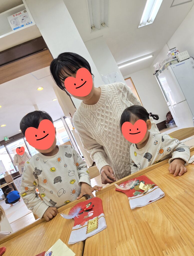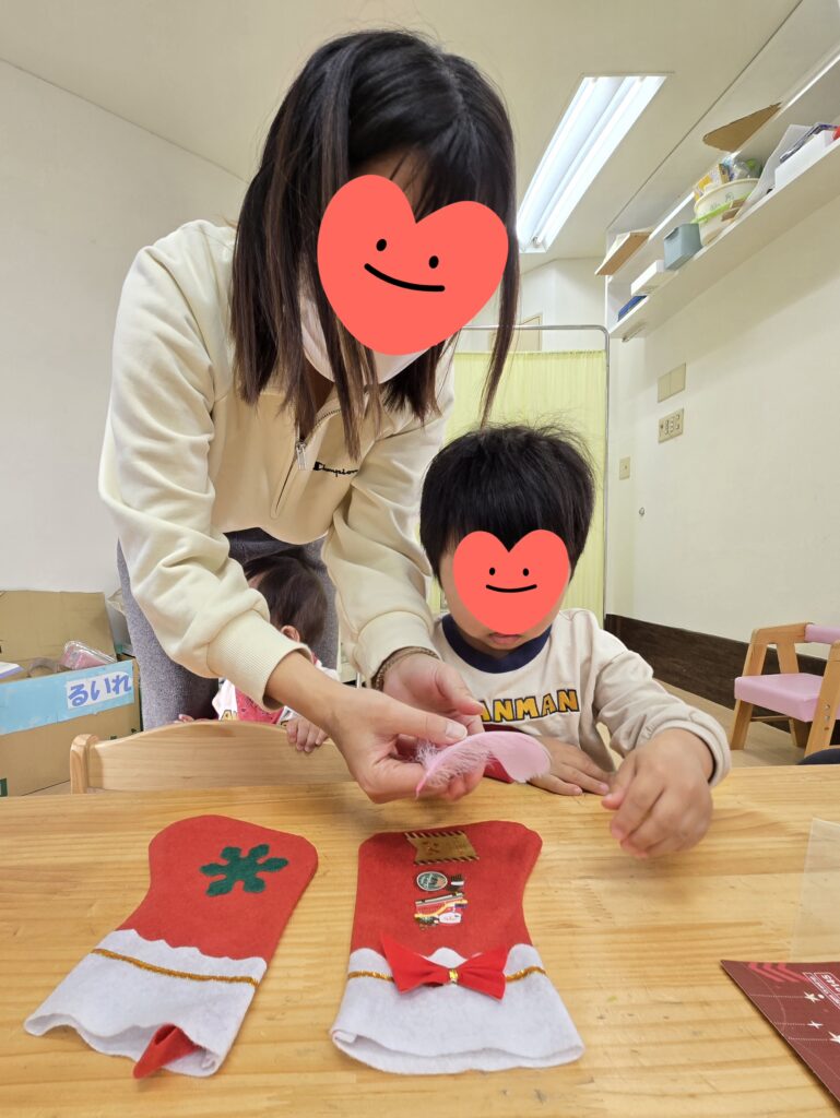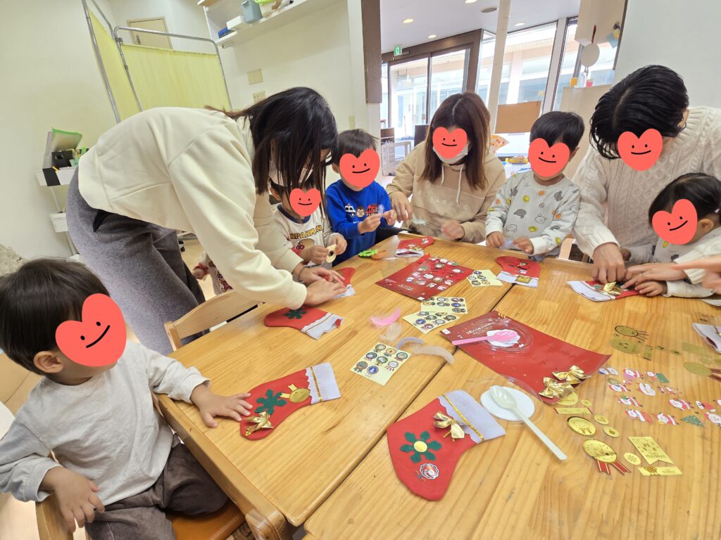 12月のみんなのひろばが開催されました😊今回はみんなでクリスマス制作~🤗赤いくつしたにシールや羽やリボンをくっつけました🎀お家に飾ってくれるとうれしいな~😝