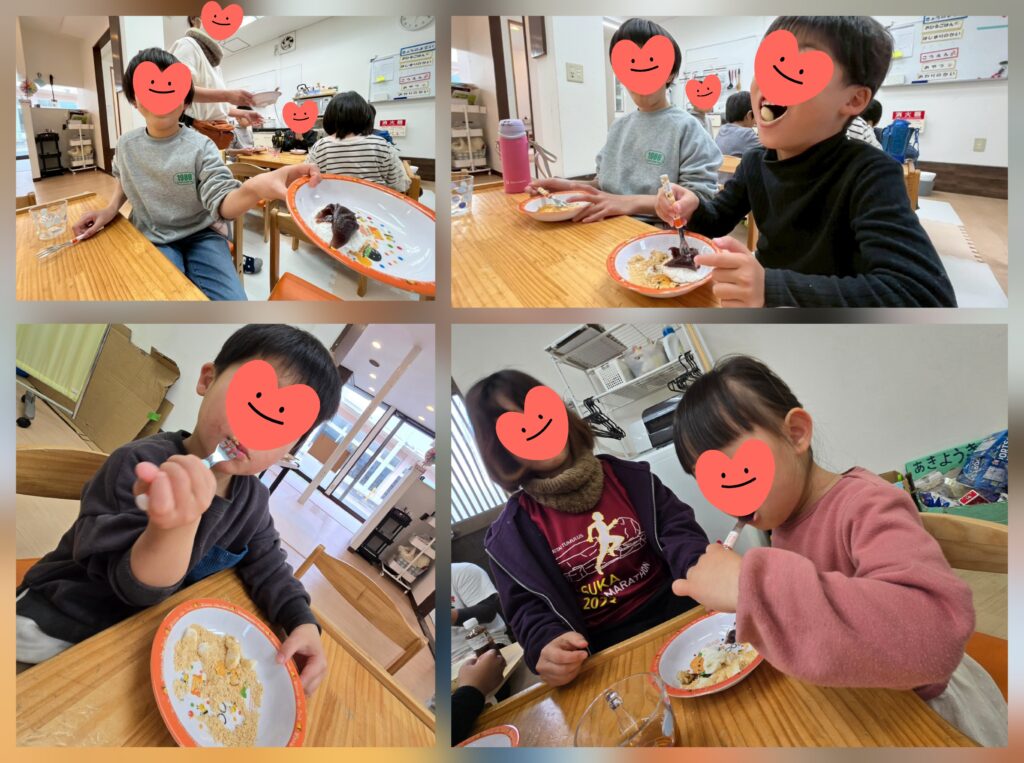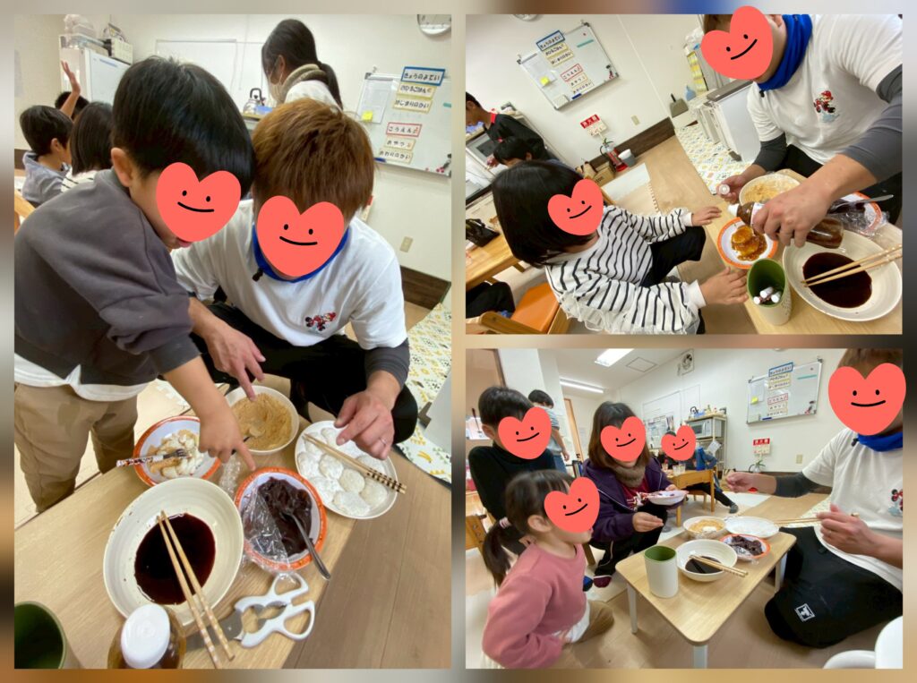 年末恒例おもちつきをしました😊もち米をめん棒でついて丸くまるめて出来上がり🤗きな粉・あんこ・砂糖醬油・玉ねぎポン酢の4種類から好きな味を選んで「いただきま~す!」「つぎは違う味にしてみる~😚」とたくさんおかわりもしてくれました🥰
