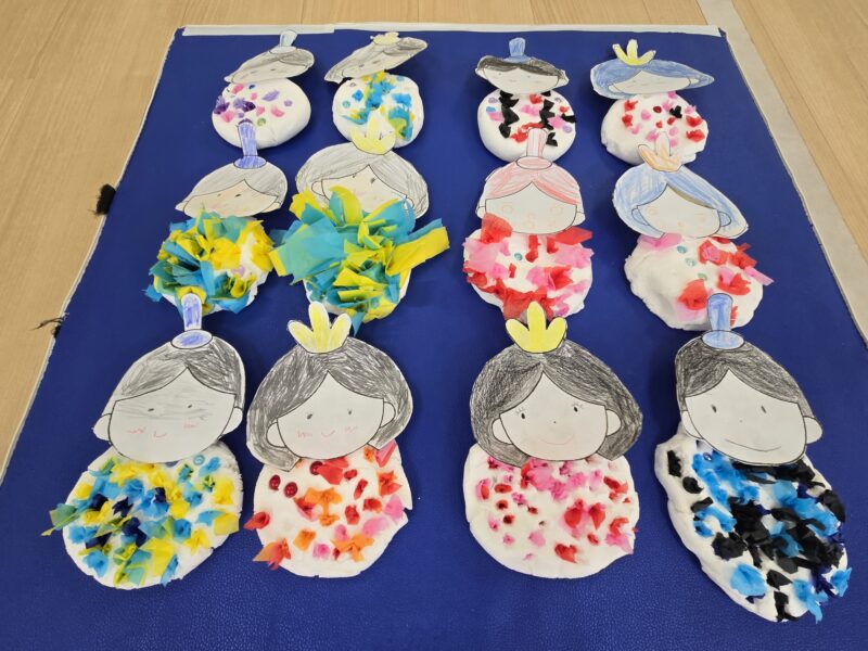 続きを読む3月の壁面制作スタート!顔の部分をハサミで丁寧に切りお人形のような表情を描き込んでいきます~🎵次にこねて丸めて平たくした紙粘土に好きな色のおはながみを小さく切って竹串で押し込んでいくと花びらのようになりました~🌸さてこれ …
