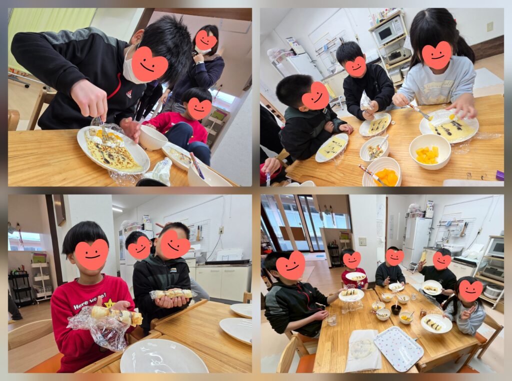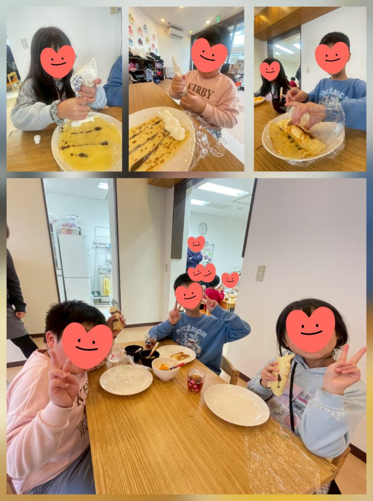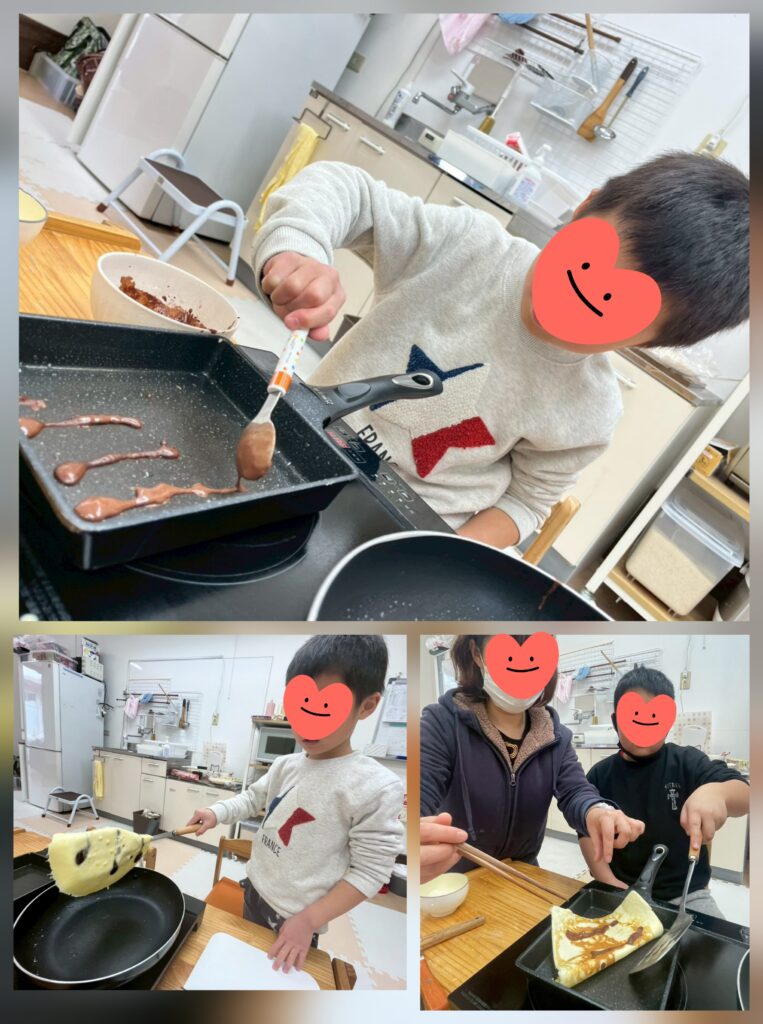 節分クッキングで「鬼の恵方巻クレープ」を作りました😊ココア生地でフライパンに線を描いた後、白のクレープ生地を流すことで虎の模様を作りました🐯