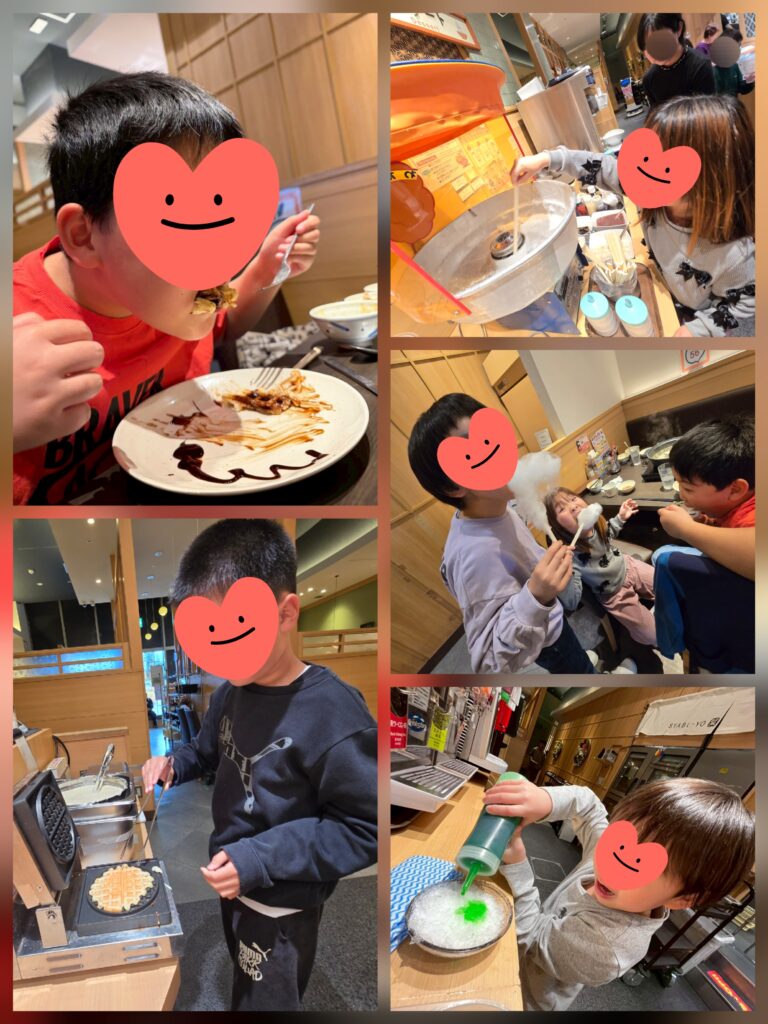 たっくさん食べたけどデザートは別腹🍨😋🍧ソフトクリームにわたがしにワッフルにかき氷。。全種類食べたくなる~😆ちょっと休憩したらまたおかわりに行く子ども達🤭本当にお店に2時間くらい滞在してました😅