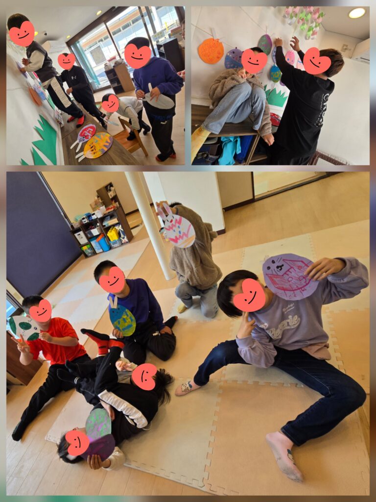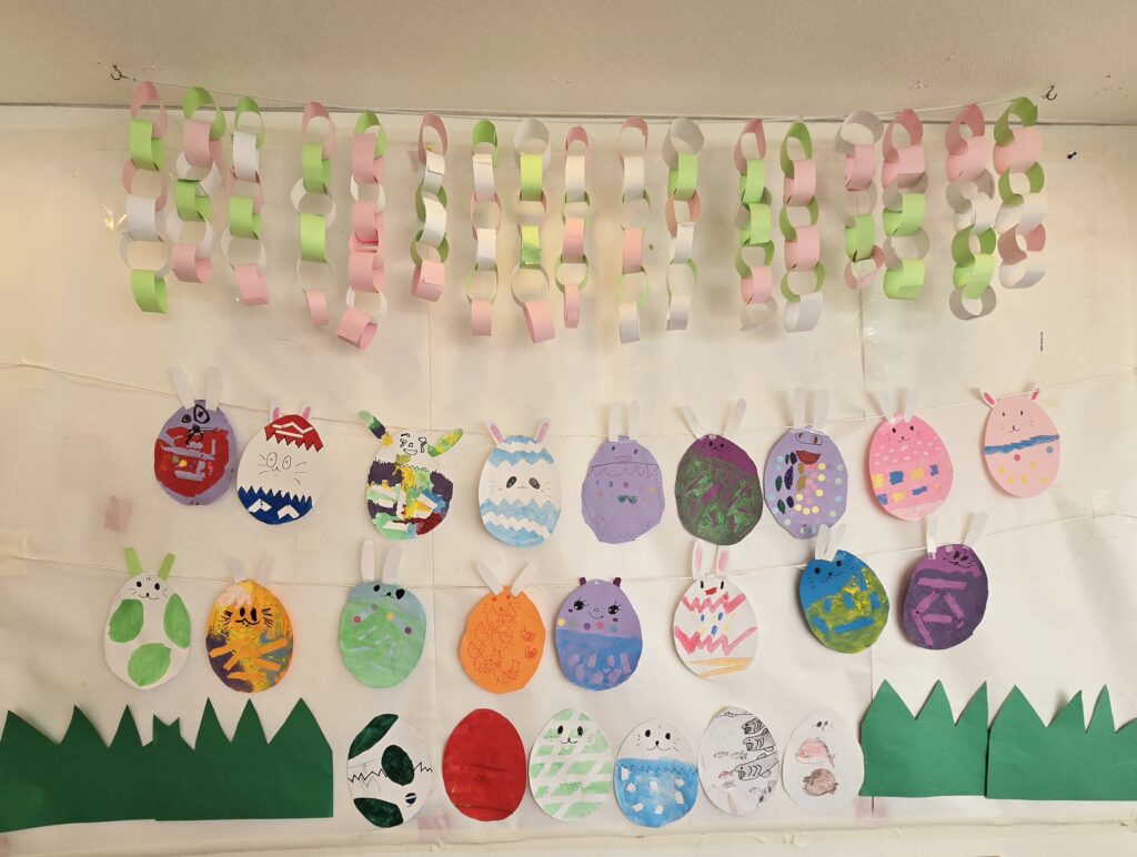 4月の壁面「イースターの卵」が完成しました😊自分や友達の作った作品を壁に貼りつけてます~🥚ウサギの耳がついてるのもかわいい🥰