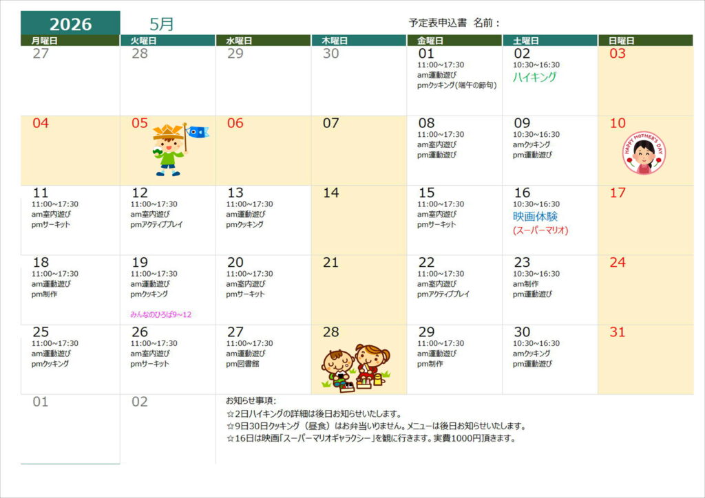 5月の予定表が出来ました😊GW明けがいよいよ新年度本番!勉強に遊びに楽しもうね~🤭