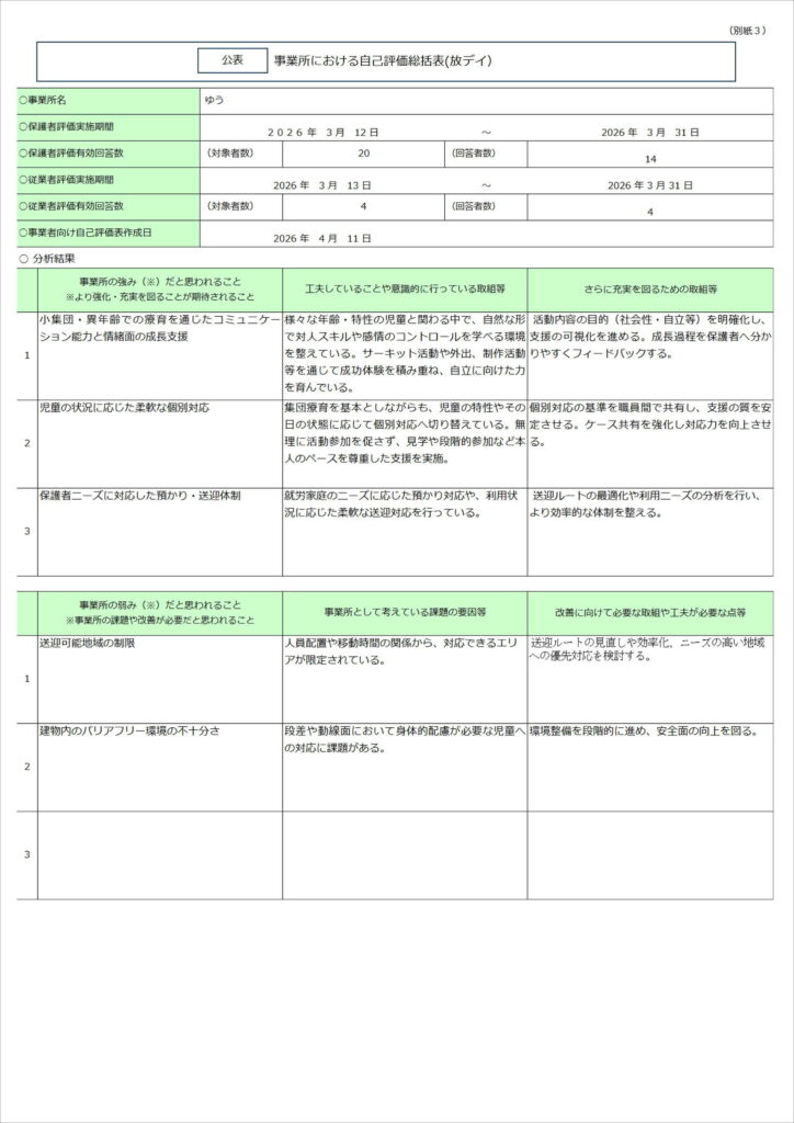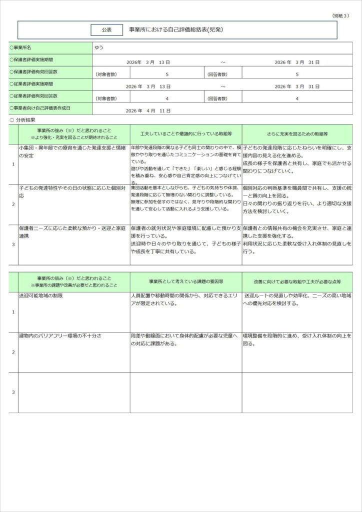 児童発達支援・放課後等デイサービスの保護者評価結果及び自己評価結果を公表いたしましたので、トップページメニュー「自己評価(令和7年度)」よりご覧ください。