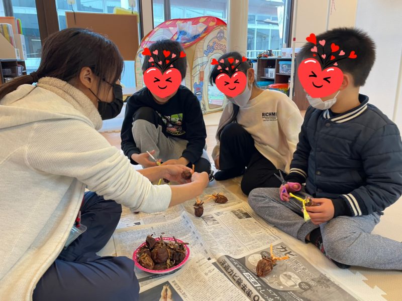 11月に皮をむいてヒモで結んで玄関先に吊るしておいた干し柿が食べごろになってきたので子ども達に取ってもらいました😚しわしわで固くなり少し黒くなっている柿に戸惑いを見せながら。。😅小さく切って「食べれるんだよ」と渡してみる …