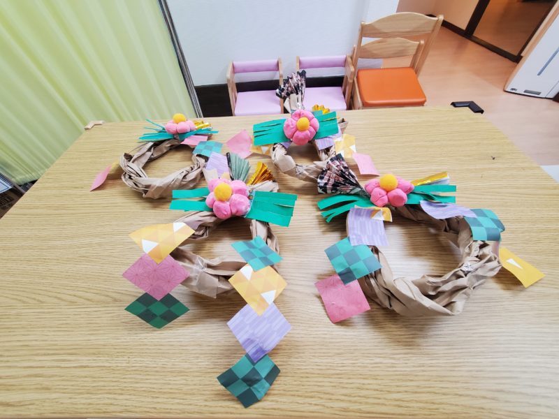 1月の壁面制作スタート!お正月に玄関に飾るものと言えば。。クラフトペーパーでしめ縄を作って、折り紙で紙垂(かみしで)を作りました😄真ん中の椿の部分は紙ねんどに絵の具で色をつけました🌸じゃばら折りの飾りもつけて完成です✨✨ …