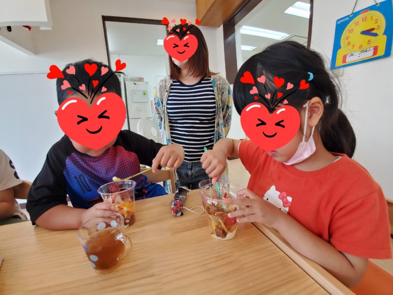 おやつクッキングで「フルーツパフェ」を作りました🍒今回は切ったり混ぜたりではなくお客さんが「これ入れてください🙋」と注文するとお店屋さんが「はいどうぞ」と入れてくれる形式にしてみました😊最初に職員さんに「好きな物だけたく …