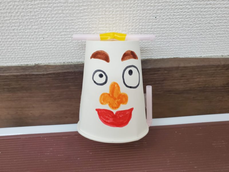 制作で「動く紙コップ人形」を作りました☆職員さんの作り方説明をみんな真剣に聞いていました。つまようじを使って輪ゴムをビーズの穴に通したり、ストローで輪ゴムをねじるハンドルを取り付けたり、指先を使う細かい作業が続きます。「 …