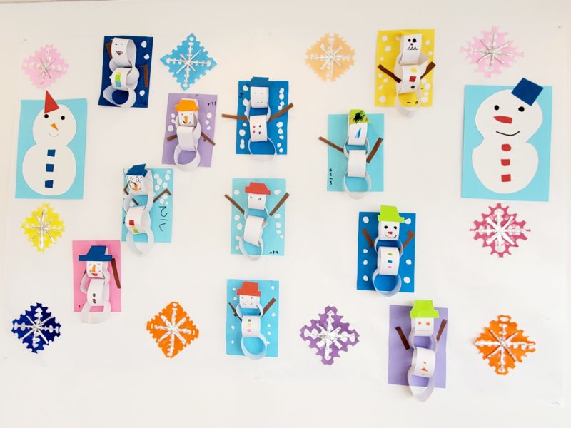 2月の壁面制作をしました。細長い画用紙を輪っかにして4連でつなげたら、好きな顔を描いて帽子や飾りをくっつけてかわいい雪だるまさんの出来上がりです♡ 指でのりを上手にすくって、輪っかを持ちつつ貼りつけることができてますね~ …