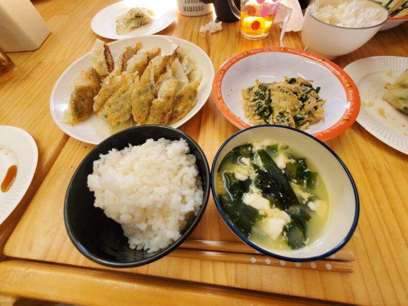 今年最後の昼食クッキングは「餃子」「ニラ玉炒め」「中華スープ」を作りました😊ニラ・キャベツ・豆腐などの具材を丁寧に切り、卵を割ってかき混ぜるのも手慣れたものです🤭餃子の餡が出来たら皮に包みましょー😊包んだ時に餡がはみ出さ …