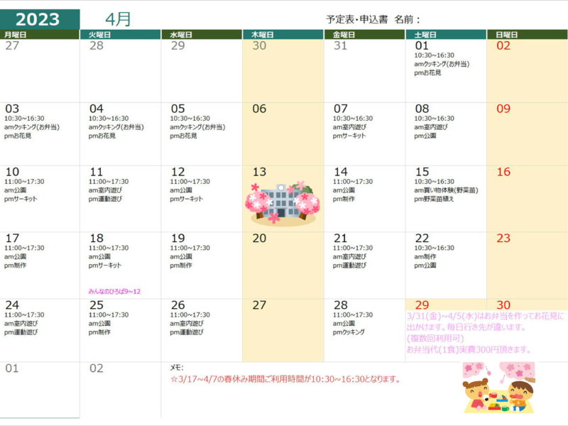 入園、入学、進級の4月🌸環境が変わってすこ~し慌ただしくなるけど、自分のペースで過ごしていこうね😊 3/17(金)~4/7(金)の春休み期間ご利用時間が10:30~16:30となります。ご確認よろしくお願いいたします。 …