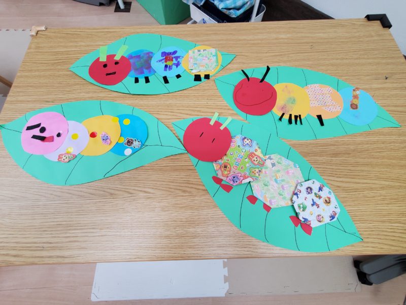 3月の壁面「あおむしさん」が完成しました!想像力をふくらませながら4枚の丸い画用紙に顏・触角・体の模様・足を描いたり貼りつけて葉っぱの上に乗せました😚たくさんのあおむしさん達が「春はそこまで来てますよ~🌹」とお知らせして …