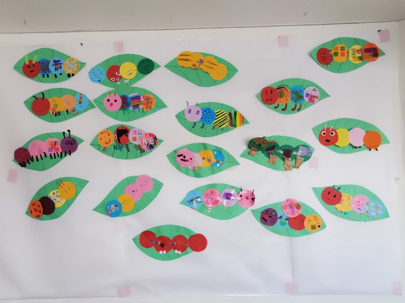 3月の壁面制作スタート!色違いの丸い画用紙に模様を描いたり貼ったりしたら全部つなげて顏も描いて葉っぱの上に置いたら...さて何に見えるでしょ~か❓🐛