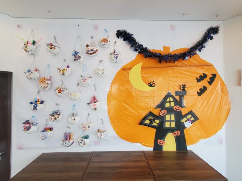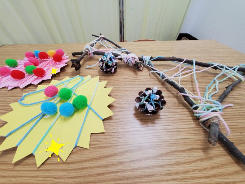 11月壁面制作スタート!星形の台紙や三角に結ばれた枝にカラフル毛糸をクルクル巻きつけたりボンボリを貼りつけました🤗まつぼっくりにはビーズをくっつけて秋仕様の飾りが出来ていますよ~🍂