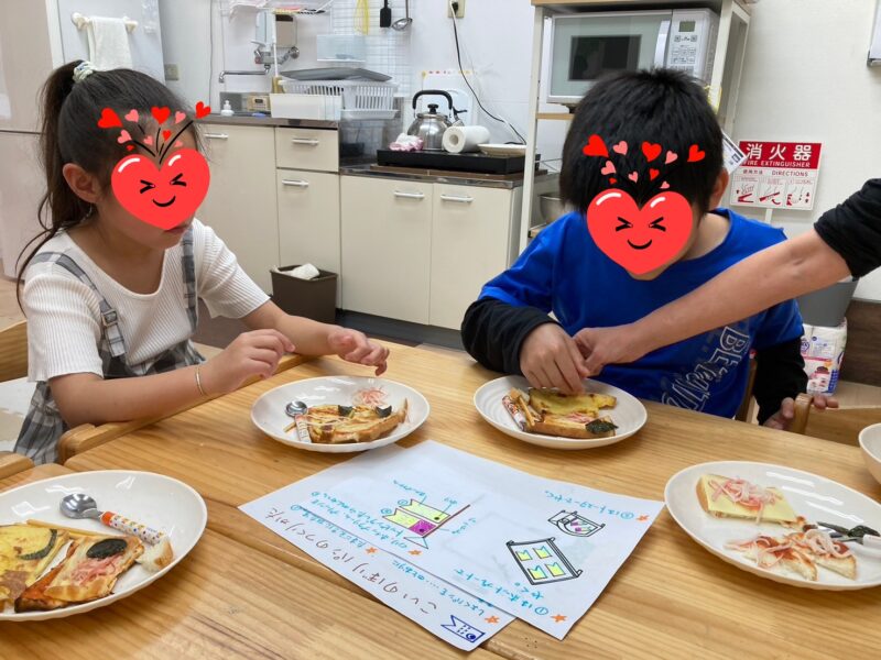 こどもの日おやつクッキングはフレンチトーストとピザトーストの2種類の味で「こいのぼりパン🎏」を作りました😊スライスチーズ・カニカマ・海苔を模様や目の部分にするための下準備をした後は、食パンをこいのぼりの形に切ってピザソー …