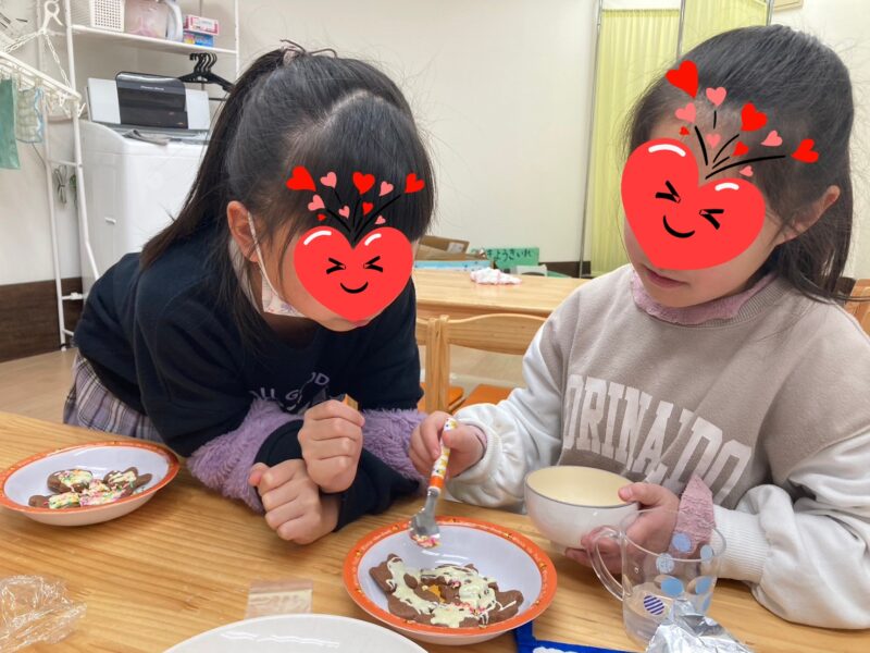 バレンタインの日に「チョコクッキー」を作りました🍪粉をふるったりチョコを溶かしたり男の子も女の子も仲良く生地作りをしたら薄くのばして型抜きです😊オーブンで焼いてからのトッピングはホワイトチョコで。。とっても美味しそうでし …