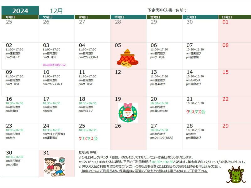 12月の予定表が出来ました😊さぁ今年のクリスマス会はどんなプレゼントをサンタさんにお願いしようかなぁ🎅 12/16~1/10の冬休み期間、平日のご利用が10:30~16:30となります。 年末年始は12/31~1/3お休 …