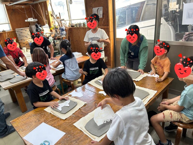 体験おでかけで「陶芸教室こうはく」さんへ行ってきました😊 あらかじめ用意しておいた🌠ほし💓ハート😸ねこ🛬ひこうき🚅でんしゃ5種類の型紙の中から1つ選んでもらい模様や顔を描いて準備オッケー🙆 こうはくさんに到着!工房の中は …