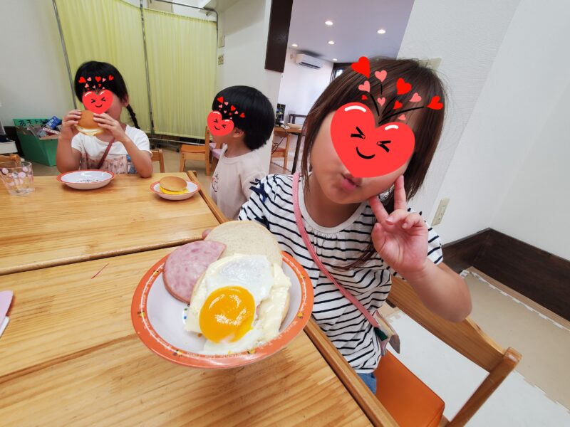 お月見クッキングで「お月見バーガー🌕」を作りました😊まずはアルミホイルを細長く折り輪っかにして、目玉焼きの型を作ってもらいました😙 その型をホットプレートに乗せ卵を割ってもらいましたが、上手く割れなかったお友達も「スクラ …