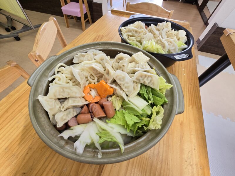 昼食クッキングで「寄せ鍋🍲」を作りました😊 冬はやっぱりお鍋でしょ😝えのき・人参・白菜・ウインナー・肉団子・ぎょうざ・とうふ・うどんを鍋にきれいに盛りつけて、お出汁を入れてグツグツ煮ていきます~😀 あなたの好きな具材はな …