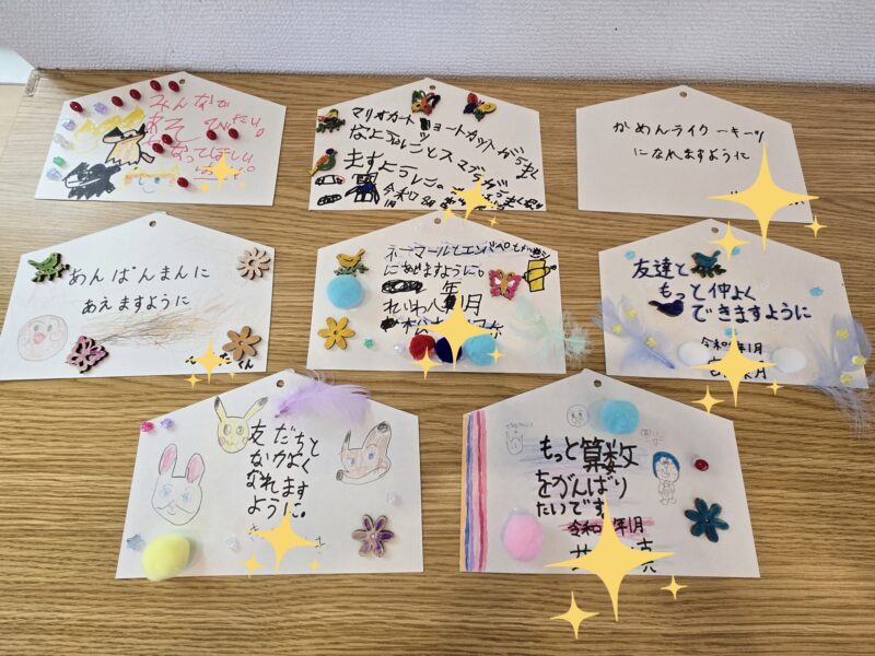 1月の壁面制作スタート!「今日は絵馬に新年に向けての抱負や願いごとを書いてもらいます~😊」と話すと、「えまってなーにー?」という返事が返ってきました・・・😓とにかく見本を見てもらって「こんなん作るんやな~。」とわかっても …