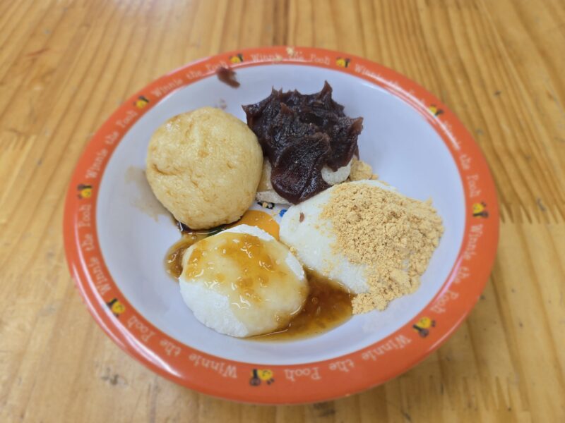 年末恒例おもちつきをしました😊もち米をめん棒でついて丸くまるめて出来上がり🤗きな粉・あんこ・砂糖醬油・玉ねぎポン酢の4種類から好きな味を選んで「いただきま~す!」「つぎは違う味にしてみる~😚」とたくさんおかわりもしてくれ …