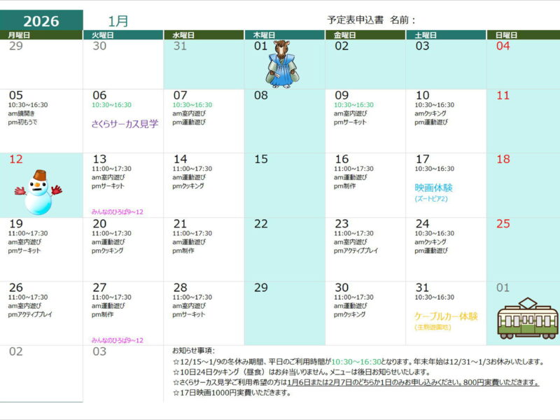 1月の予定表が出来ました😊初もうで⛩️サーカス🎪映画🐰ケーブルカー🚠盛りだくさんで始めましょ~😝 12/15~1/9の冬休み期間、平日のご利用が10:30~16:30となります。 年末年始は12/31~1/3お休みいたし …