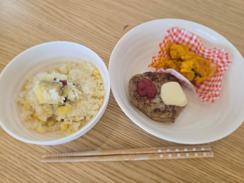 昼食クッキングで「サツマイモごはん」「ハンバーグ」「かぼちゃサラダ」を作りました😊 サツマイモごはんチームはお米の洗い方もバッチリ👍次にサツマイモを食べやすい大きさに切ってもらいました🍠1時間程待って炊飯器オープン!ほっ …