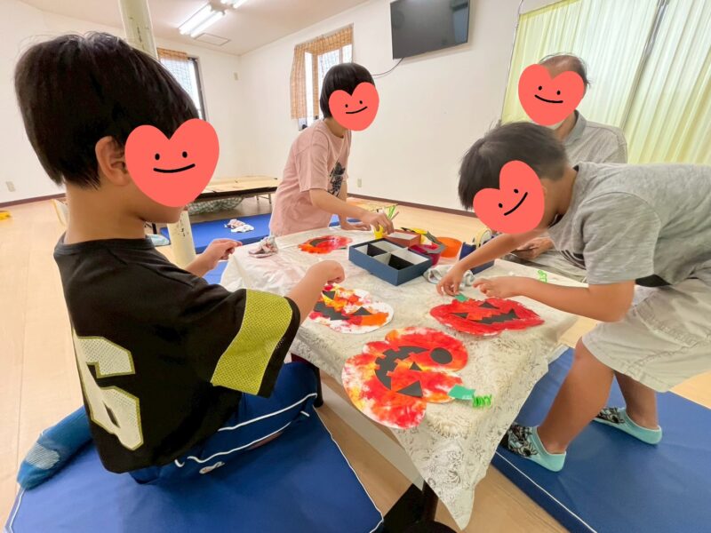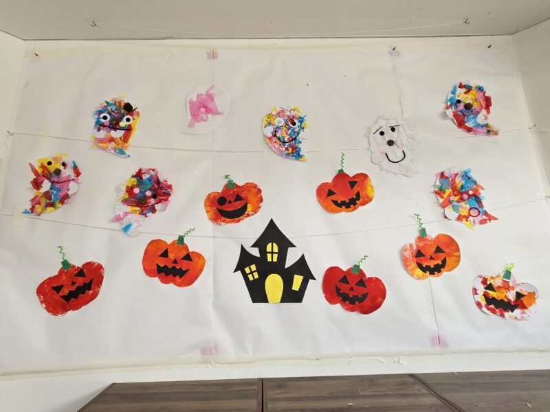 10月の壁面制作スタート!秋の訪れと共にまたアレを作り始めました~🎃今回はビニールに絵の具を出して型紙に重ねて指で押し広げてみると。。混じりあってきれいな色が出てきました😯目・鼻・口もくっつけて完成です~😚