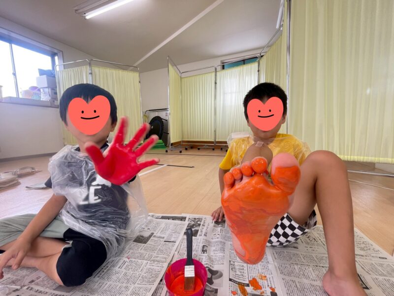 9月の壁面制作スタート!今回は手形足形スタンプに取り組みました✋👣手足に筆で塗り塗り~🎵連続でポンポンポンと押してみたり、はっきり色がつくようにギューっと押してみたり、綺麗な紅葉が出来ました🍁大きな満月も丁寧に塗ってくれ …