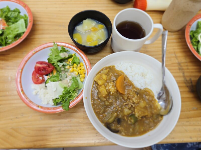 昼食クッキングで「カレーライス」「豆腐サラダ」「フルーツポンチ」を作りました😊 冷蔵庫から野菜を取り出して、洗って、切って、ちぎって。。自分で作ったら嫌いな野菜も一口食べてみようかなぁって気持ちになっていた園児の男の子🤭 …